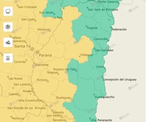 Precisamente, la advertencia incluye a las siguientes zonas: Paraná, La Paz, Diamante, Nogoyá, Villaguay, Gualeguay y Victoria.