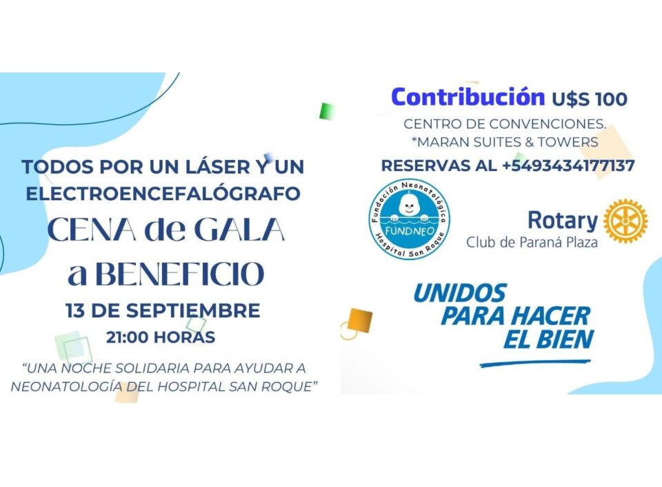 El próximo 13 de septiembre, a las 21, se realizará una Cena de Gala a Beneficio en el Centro de Convenciones Marán Suites & Towers, con el objetivo de recaudar fondos para la adquisición de un láser y un electroencefalógrafo destinados al servicio de Neonatología del Hospital San Roque de Paraná.