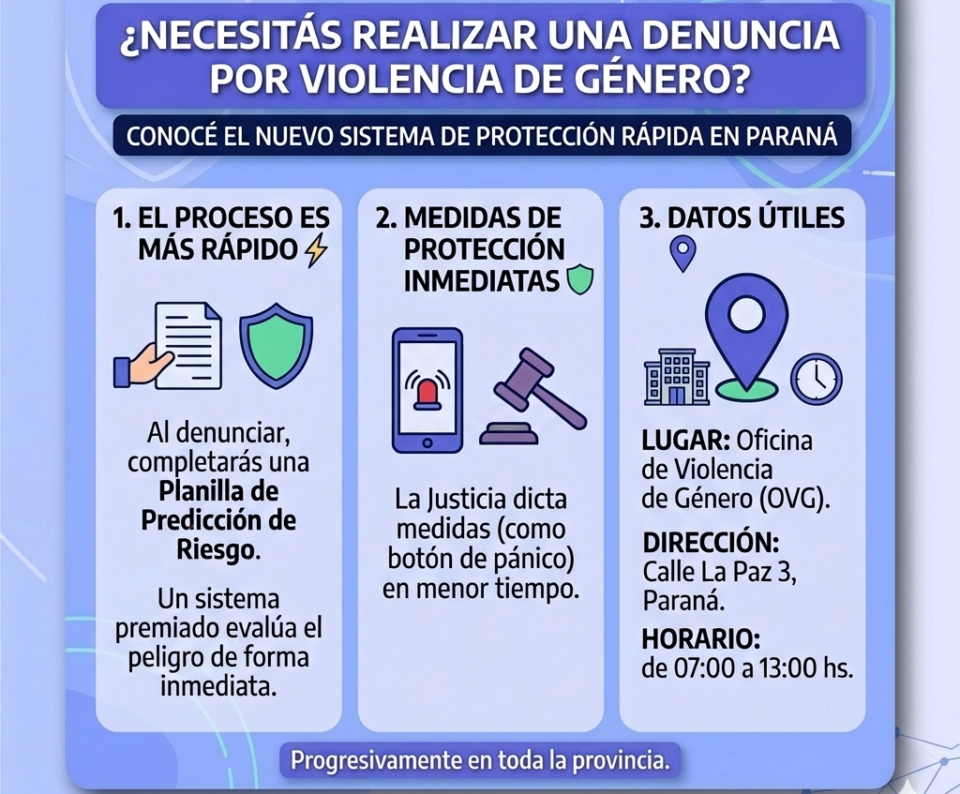 Las mujeres que necesiten o deseen realizar una denuncia o redenuncia en el marco de la ley , podrán dirigirse a la Oficina de Violencia de Género – OVG- del STJ, en calle La Paz 3, Paraná, en el horario comprendido de 7 a 13 hs donde un profesional integrante de ese organismo, recepcionará su denuncia y tras ella, será incorporada al Sistema Integral de Abordaje de las Violencias (SIAV) mediante una planilla de Predicción de Riesgo.