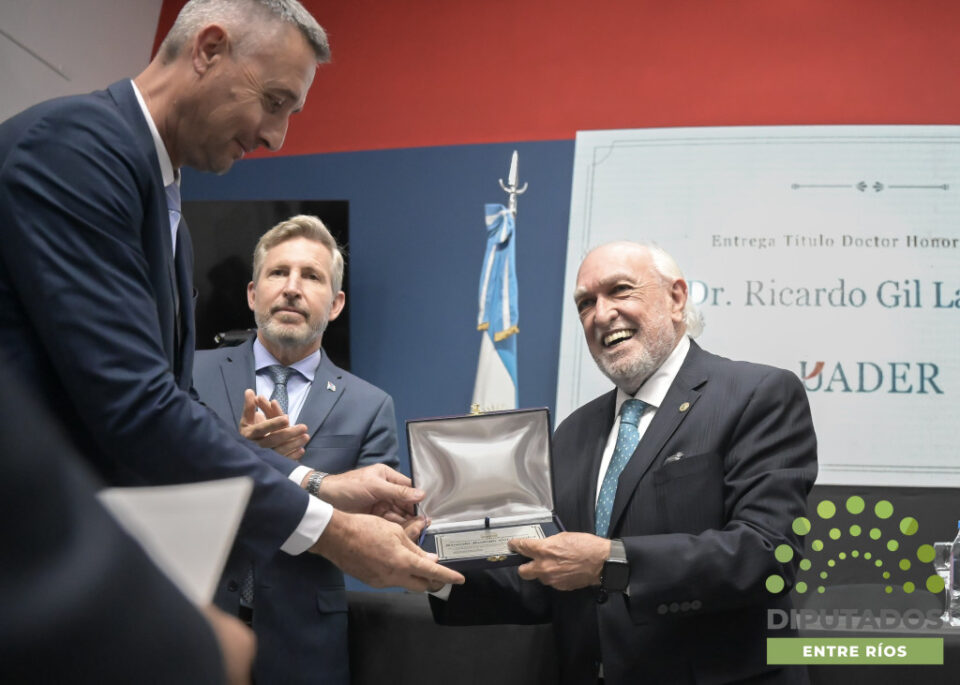 El presidente de la Cámara de Diputados de Entre Ríos, Gustavo Hein , acompañado del diputado Silvio Gallay, entregaron a Gil Lavedra una plaqueta de reconocimiento y la Declaración de Interés, aprobada por el cuerpo legislativo. El proyecto, autoría de Gallay, resalta los méritos académicos, científicos y éticos del jurista, a quien considera «un partícipe indispensable de la vida democrática del país». Además, las diputadas Carolina Streitenberger, Gabriela Lena, Noelia Taborda y Liliana Salinas presenciaron el evento en respaldo a la condecoración.
