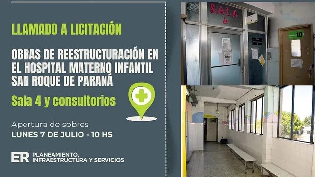 El Gobierno de Entre Ríos, a través del Ministerio de Planeamiento, Infraestructura y Servicios, publicó el llamado a licitación para la ejecución de obras en el hospital Materno Infantil San Roque, de Paraná. La intervención contempla la readecuación de un sector del primer piso del edificio, con una inversión oficial de 301 millones de pesos y un plazo de ejecución de 180 días corridos.
