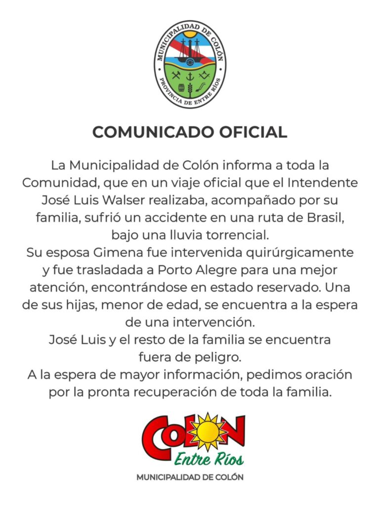 José Luis Walser, intendente de Colón, sufrió este miércoles por la mañana un grave siniestro vial. El hecho sucedió en momentos que viajaba junto a su familia rumbo a Brasil.