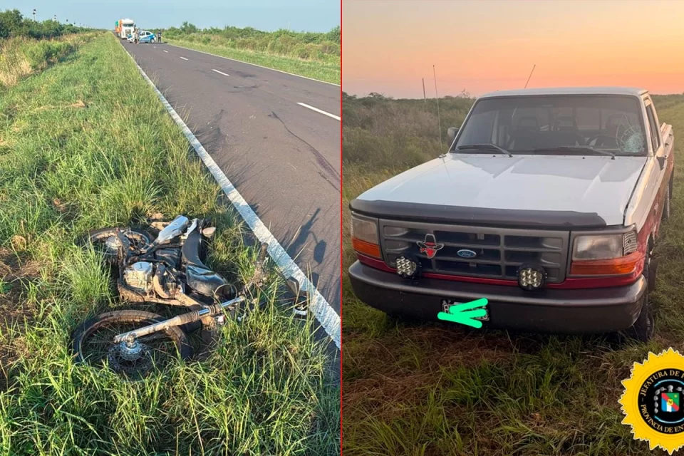 Un grave accidente de tránsito ocurrió este martes a las 06:20 en la Ruta Nacional 127, a la altura del kilómetro 187, en el departamento Federal. Por causas que se investigan, una camioneta Ford F-100, conducida por un hombre de apellido Pérez, de 49 años y domiciliado en Federal, impactó con una motocicleta Corven, guiada por un hombre de apellido Anesetti, de 35 años, quien circulaba en sentido contrario.