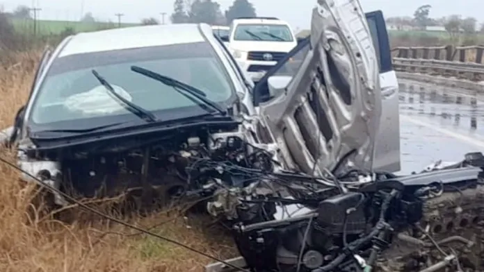 Un accidente en el kilómetro 41 de la ruta 18 dejó un auto con su parte delantera totalmente destrozada. El choque ocurrió en la zona del puente sobre el Arroyo Grande y no hubo otro vehículo involucrado.