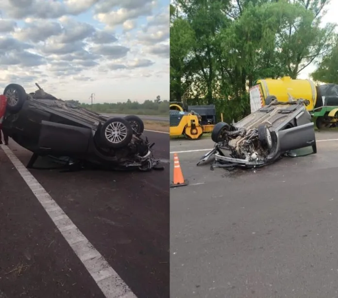 Por causas que se tratan de establecer, un automóvil Peugeot 208 que circulaba en sentido Sur–Norte protagonizó un vuelco. A raíz de la maniobra, el rodado quedó detenido sobre el carril contrario de circulación, aunque afortunadamente no impactó contra otros vehículos.